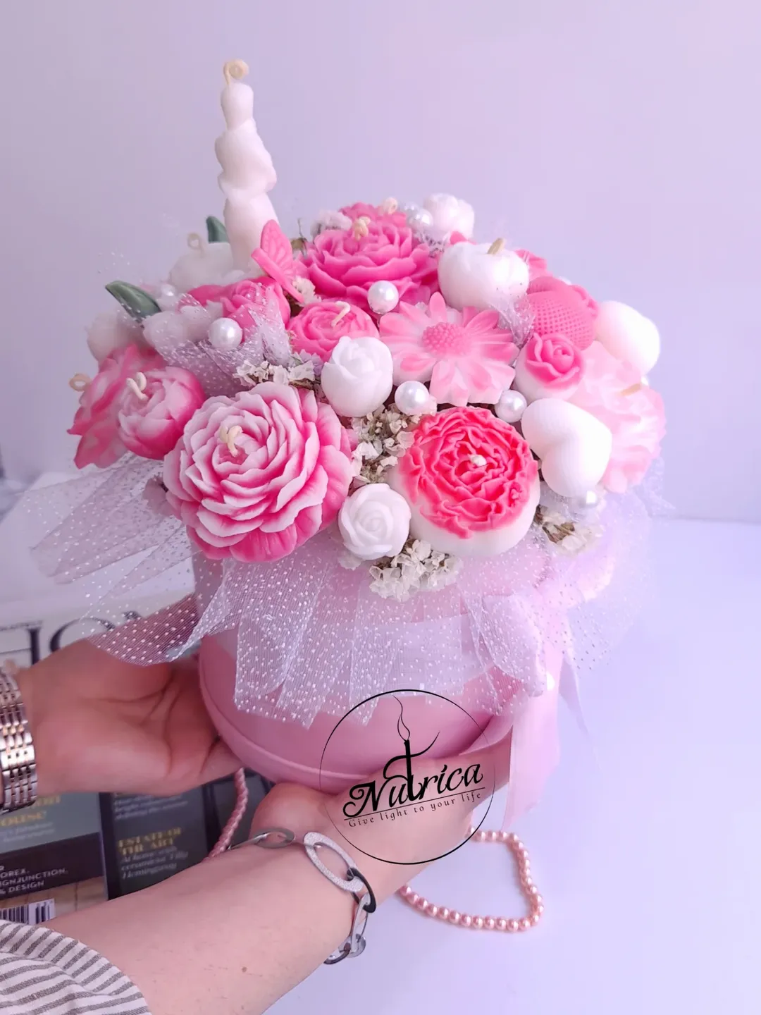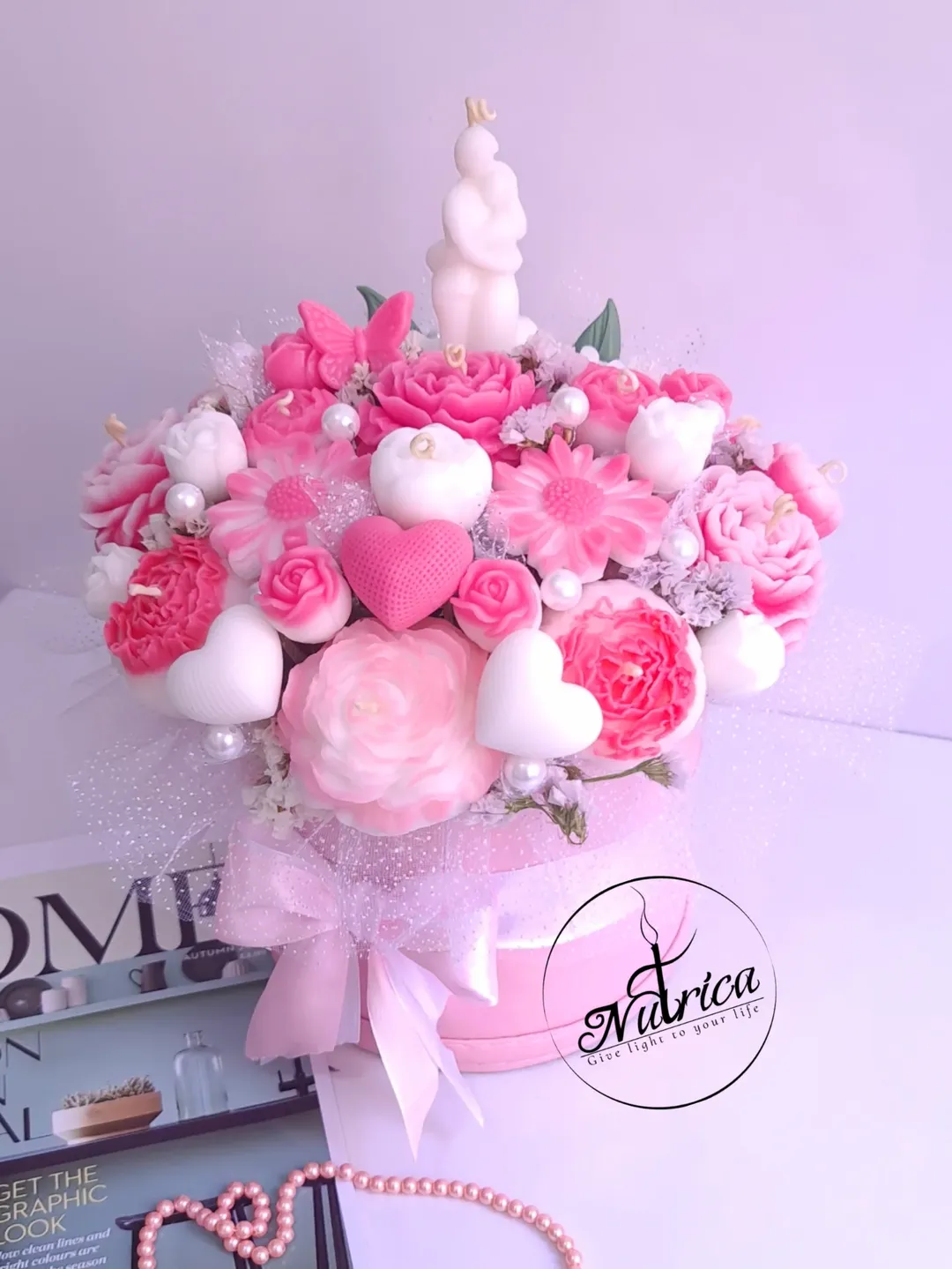 ○ ترکیبی از شمع های گل سفید و صورتی و دیزاین شده با شمع آغوشی و قلب ، تور و مروارید یه باکس شیک و زیبا برای هدیه به عشقتون