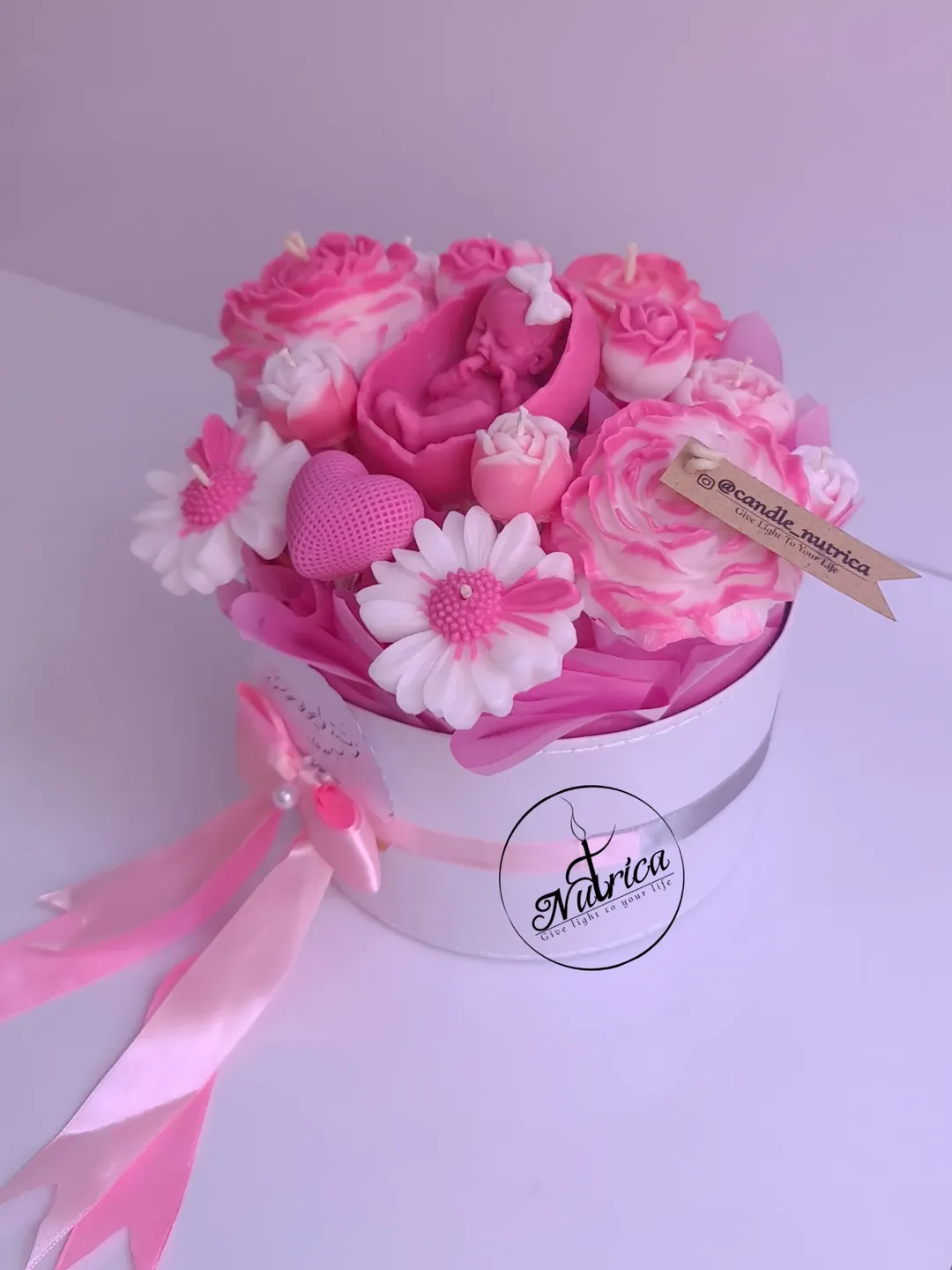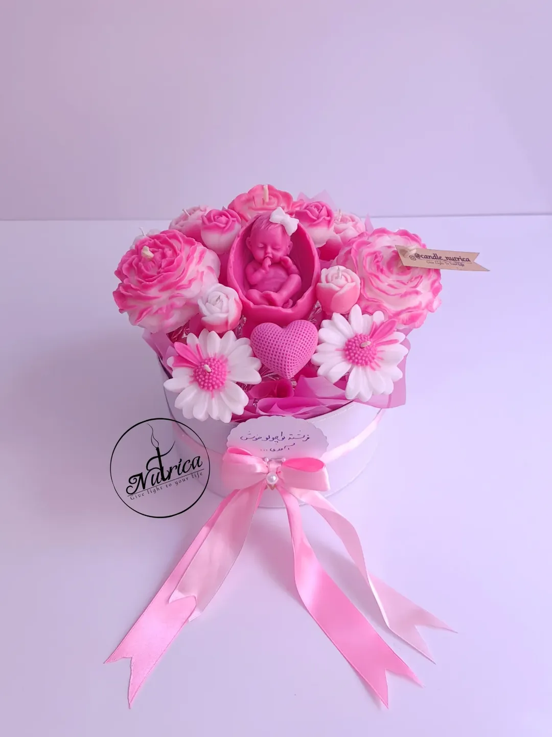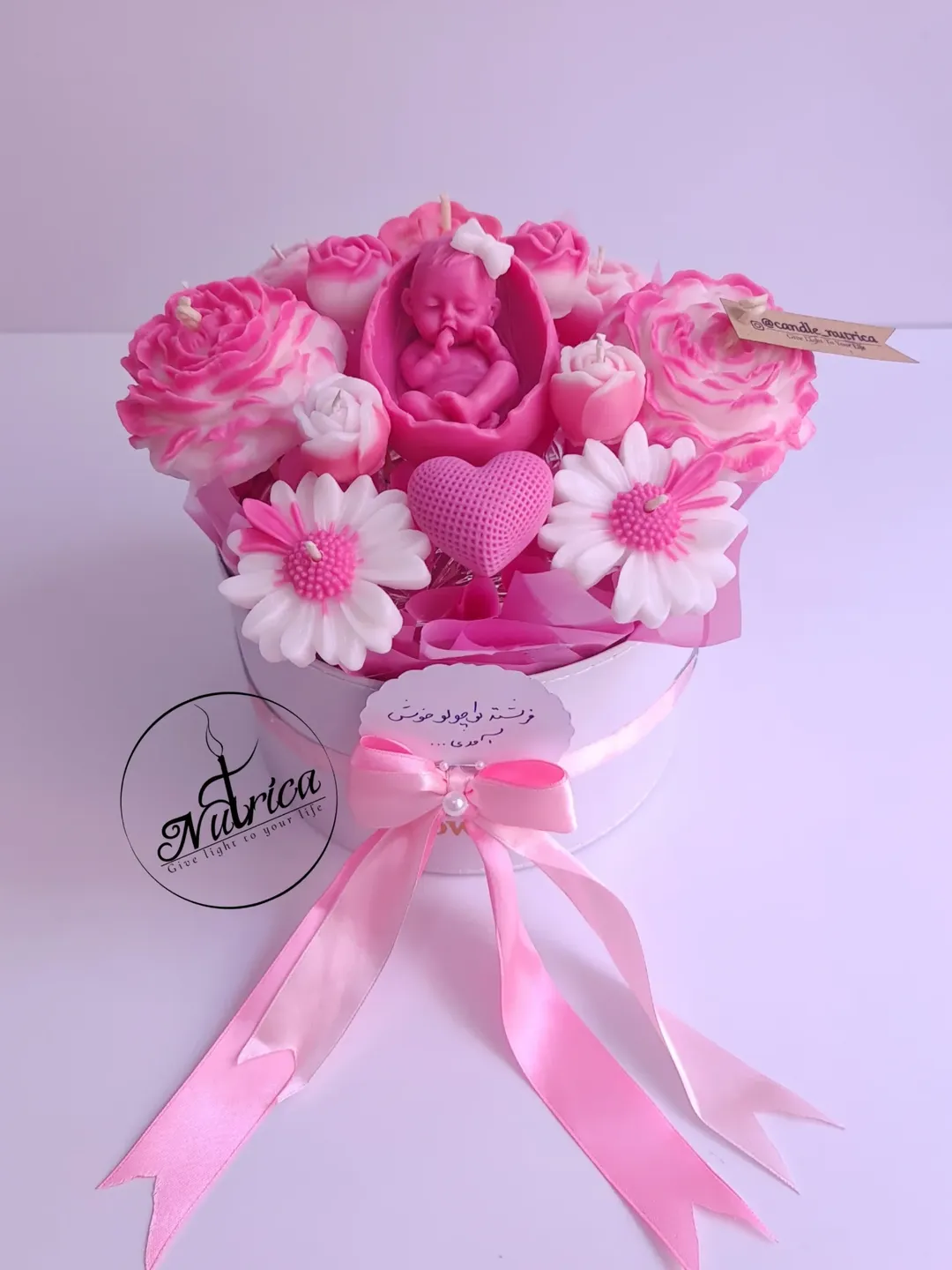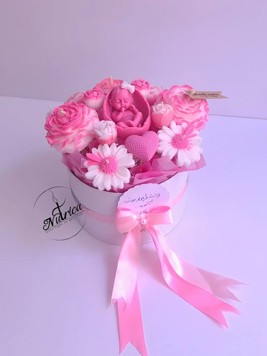 یه باکس گل شمع خوشگل صورتی برای نوزاد دختر