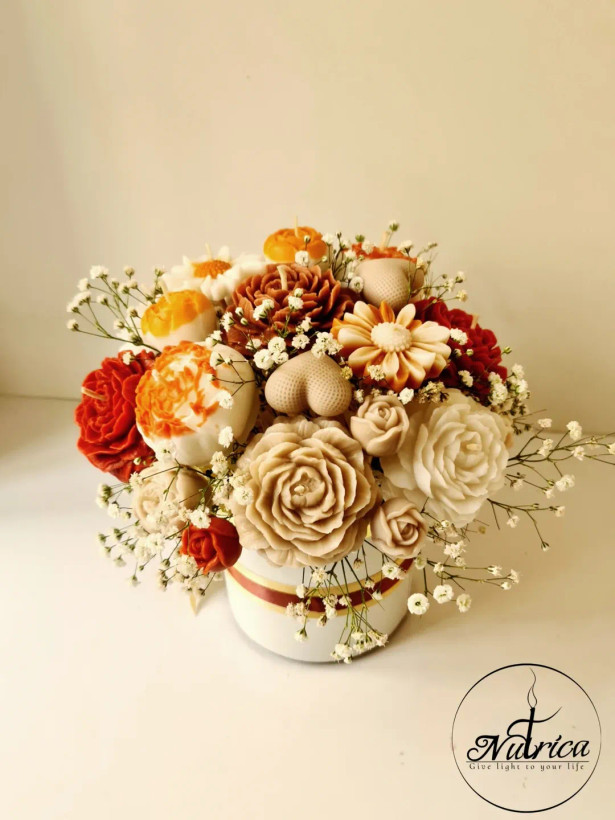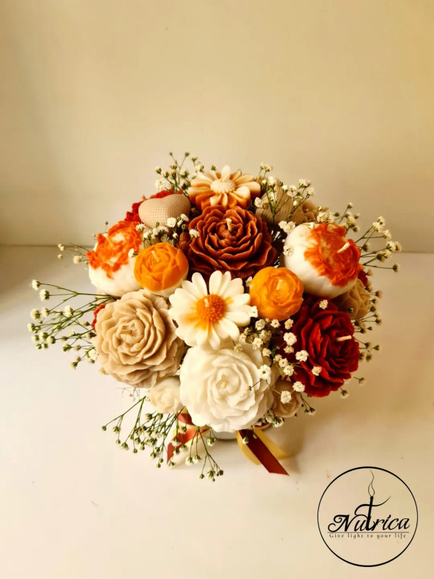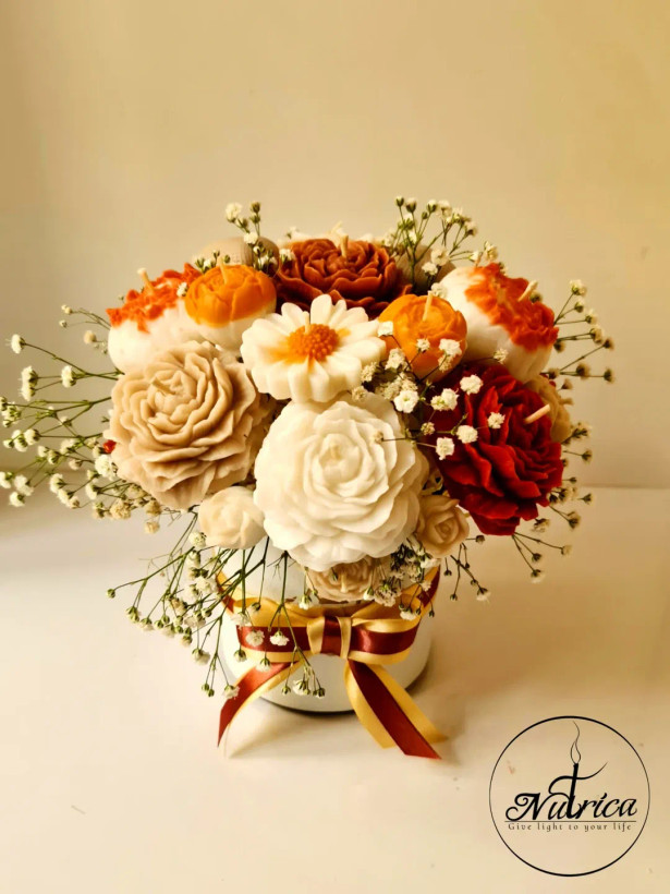 این باکس گل شمعی سایز متوسط با گلهای رنگ کرمی، قهوه ای و نارنجی دیزاین شده.