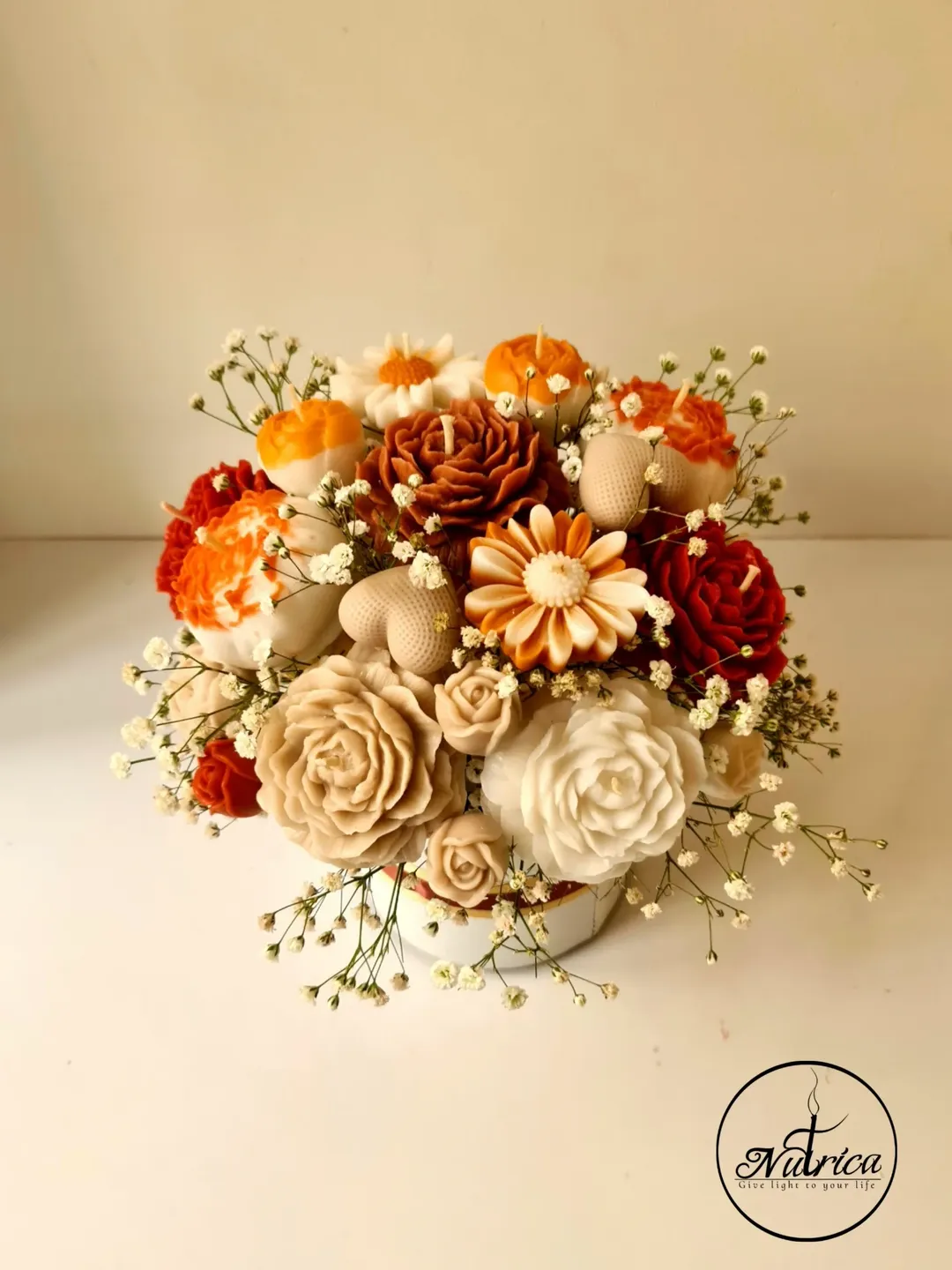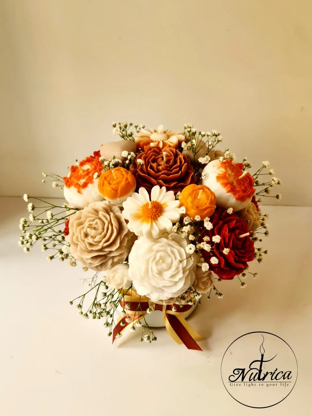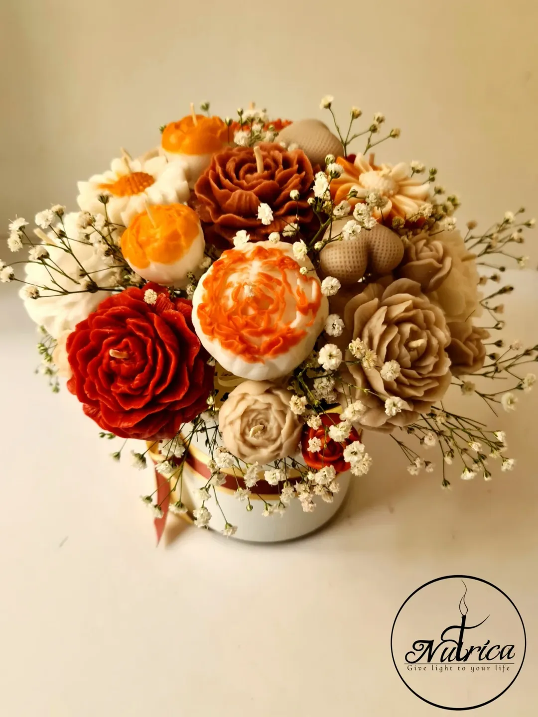 این باکس گل شمعی سایز متوسط با گلهای رنگ کرمی، قهوه ای و نارنجی دیزاین شده.