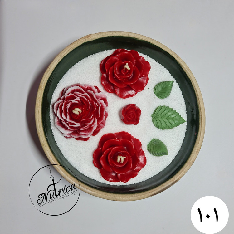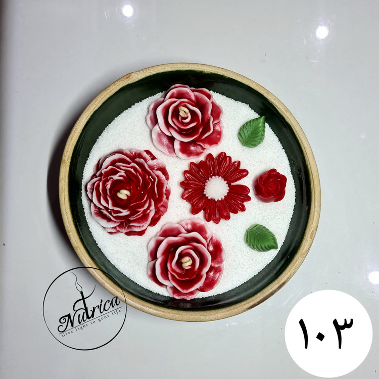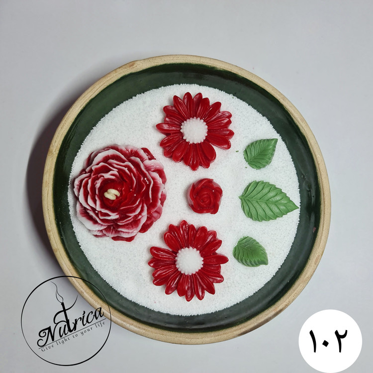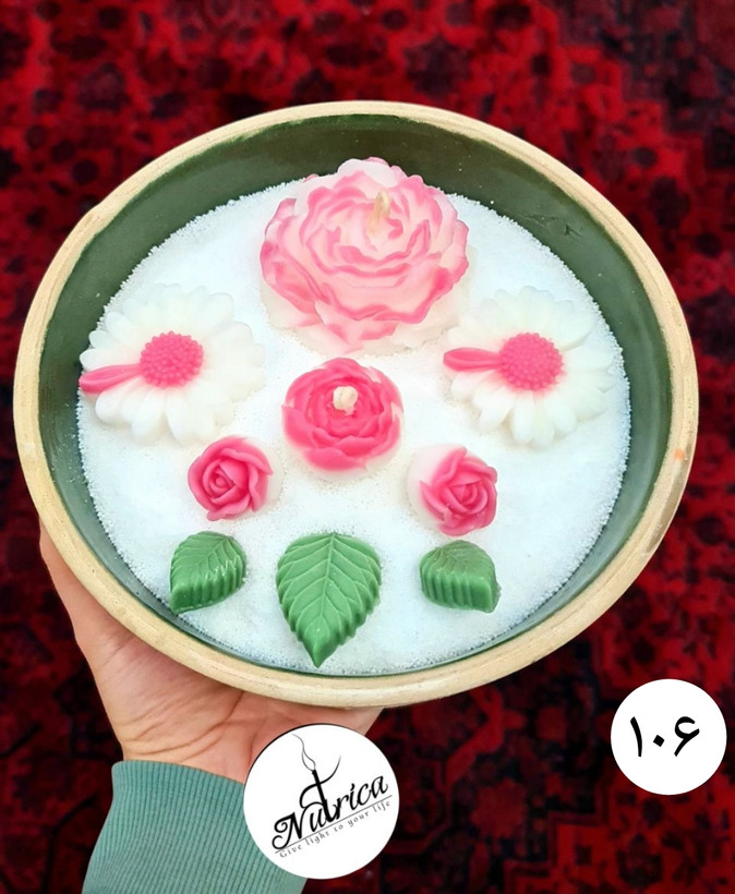 ○ دیزاین شده با شمع گل آلاله ، شمع گل بابونه ، شمع گل محمدی و غنچه رز و برگ